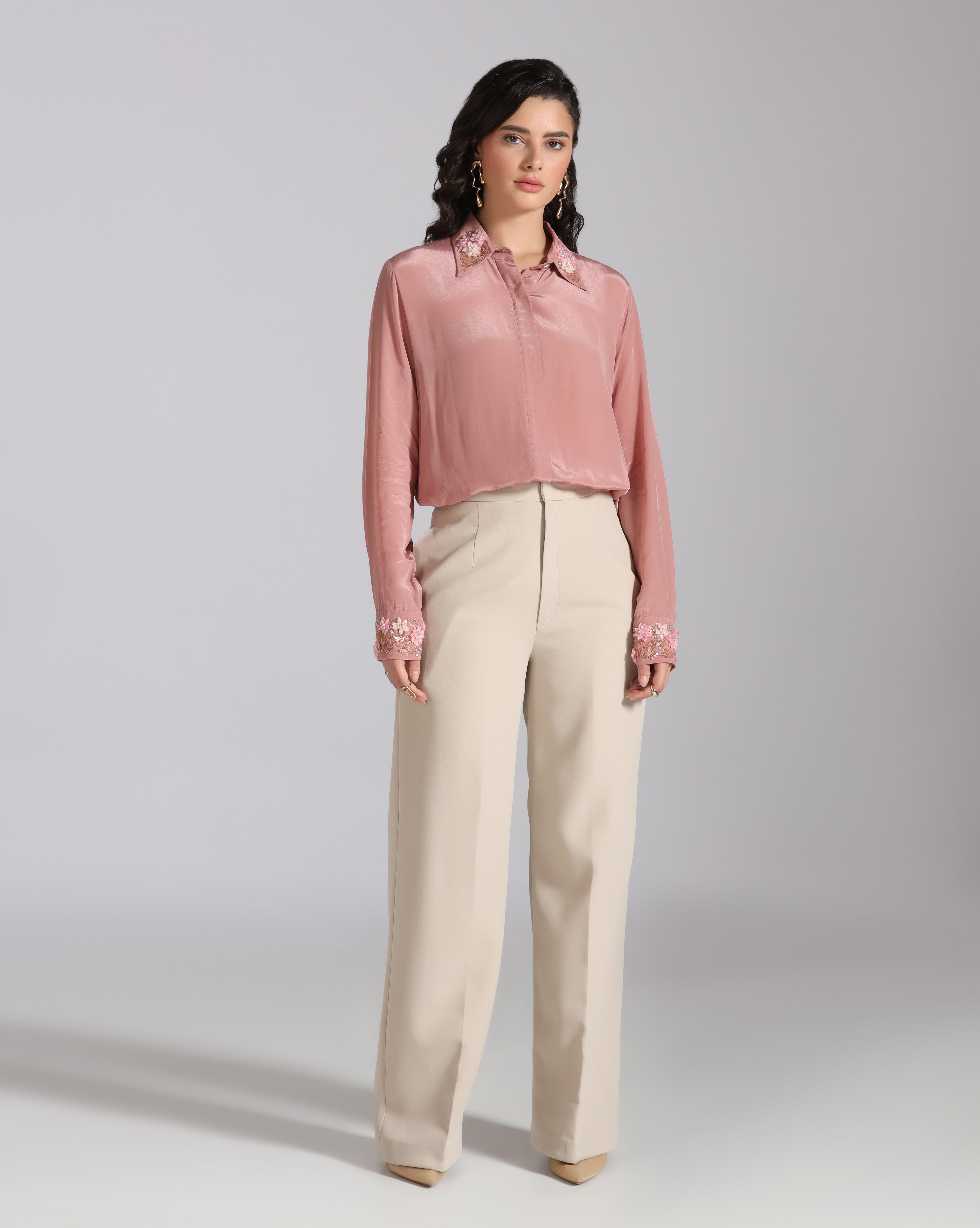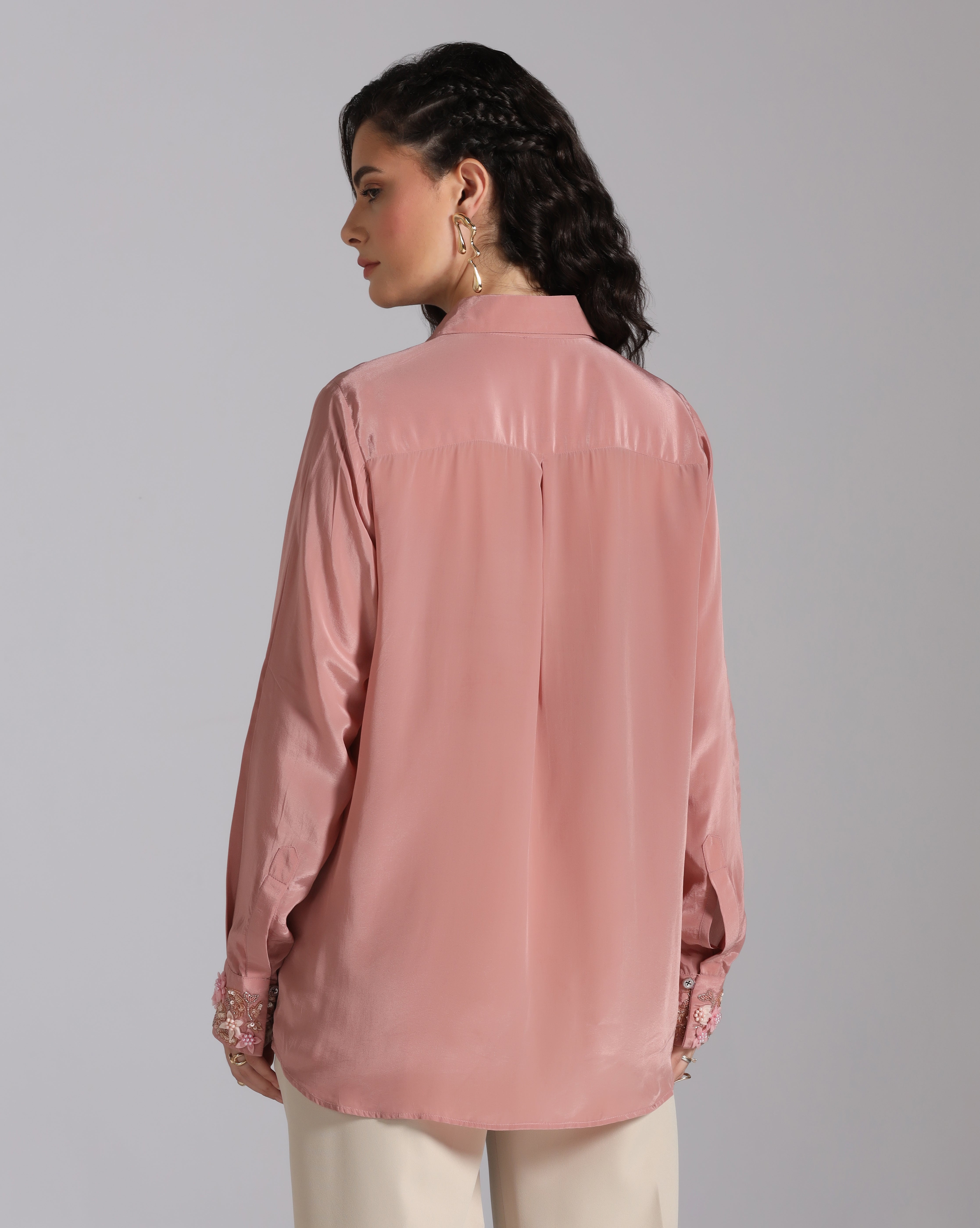 Refresh availabilitySoftly radiant in a shimmery blush hue, this shirt exudes elegance with its delicately crafted details. The collars and cuffs are beautifully embellished with floral hand embroidery, each flower accented by a pearl at the center for a touch of timeless sophistication. Perfect for evening gatherings or festive occasions, this shirt pairs artisanal charm with modern grace.