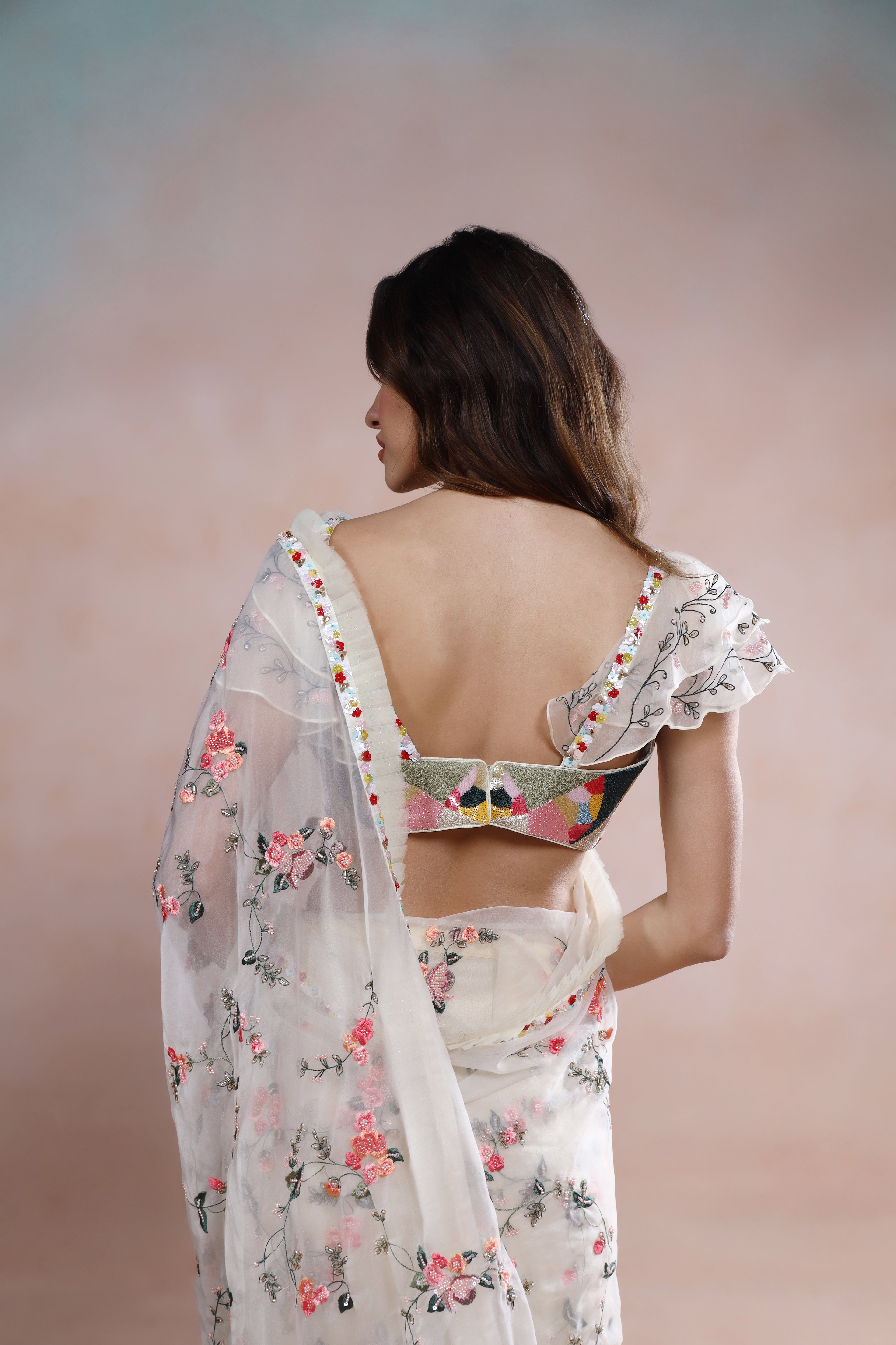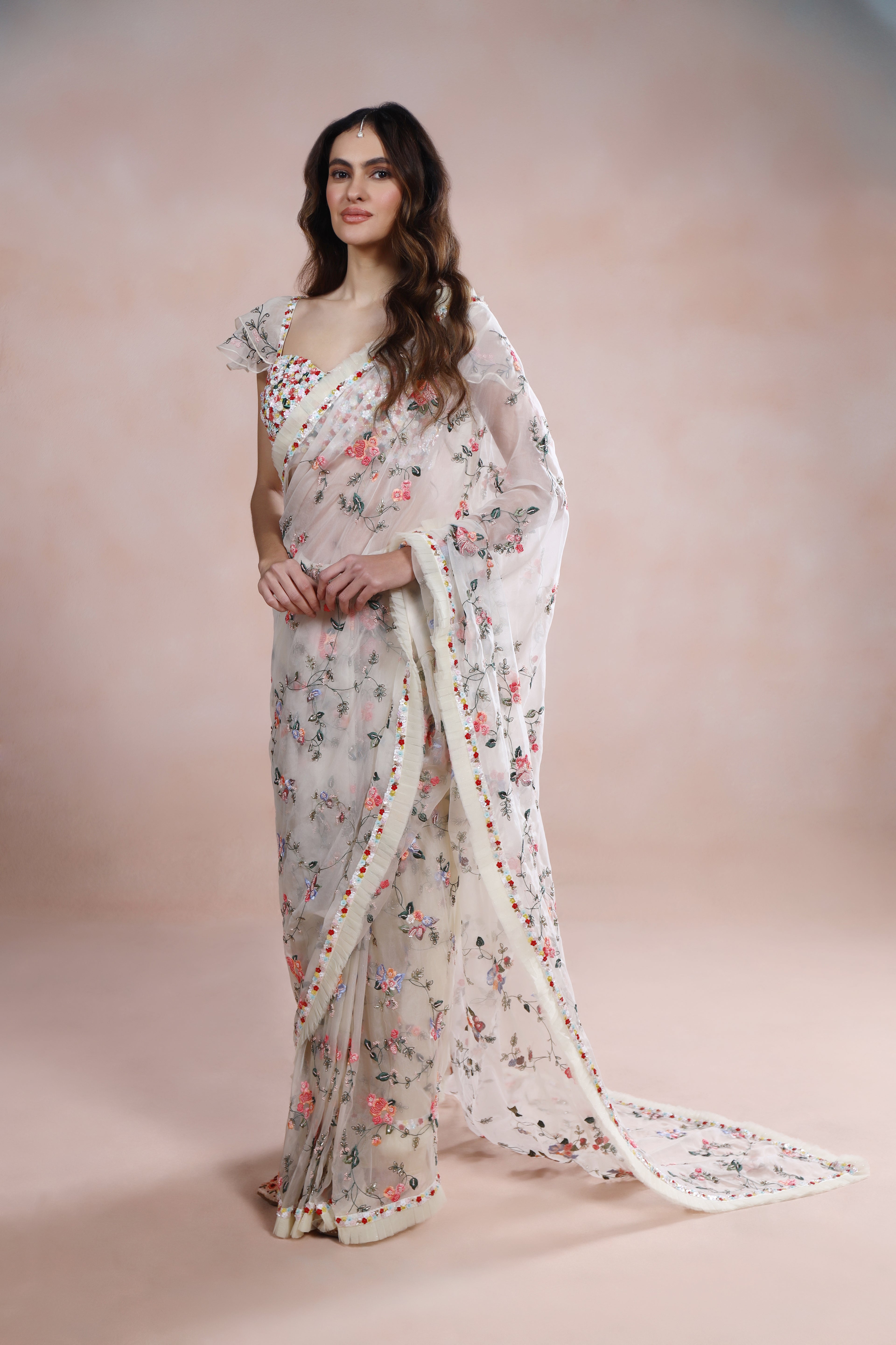 Refresh availabilityElegant with a contemporary twist, this grey saree ensemble is crafted to make a refined yet striking impression. The saree drapes with a light, fluid fall, enhanced by delicate hand embroidery with multiple colors, that adds texture and artisanal richness without weight. It is paired with a beautifully embellished, multicolored blouse that brings vibrancy and contrast, turning the look into a true statement of modern festive luxury.