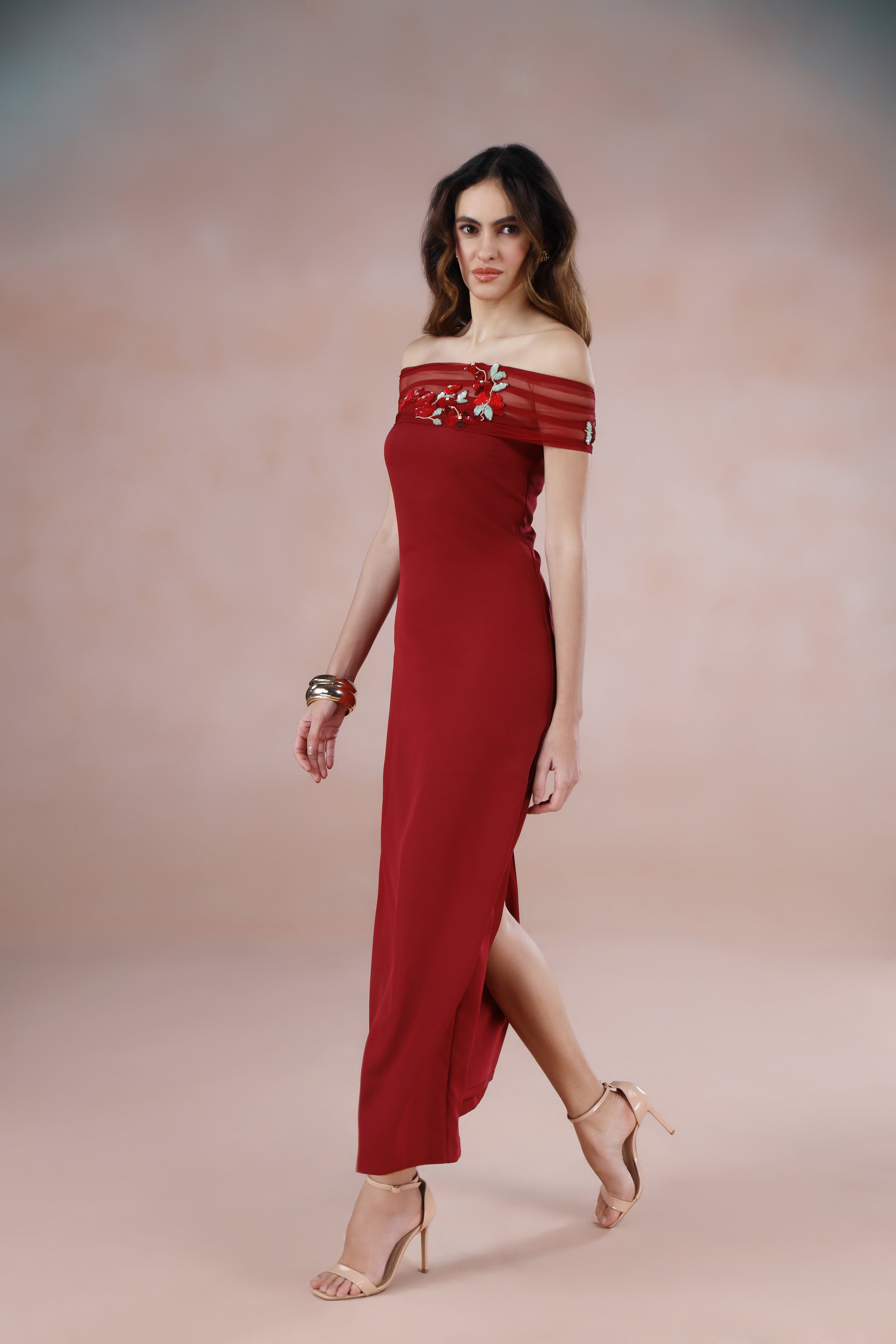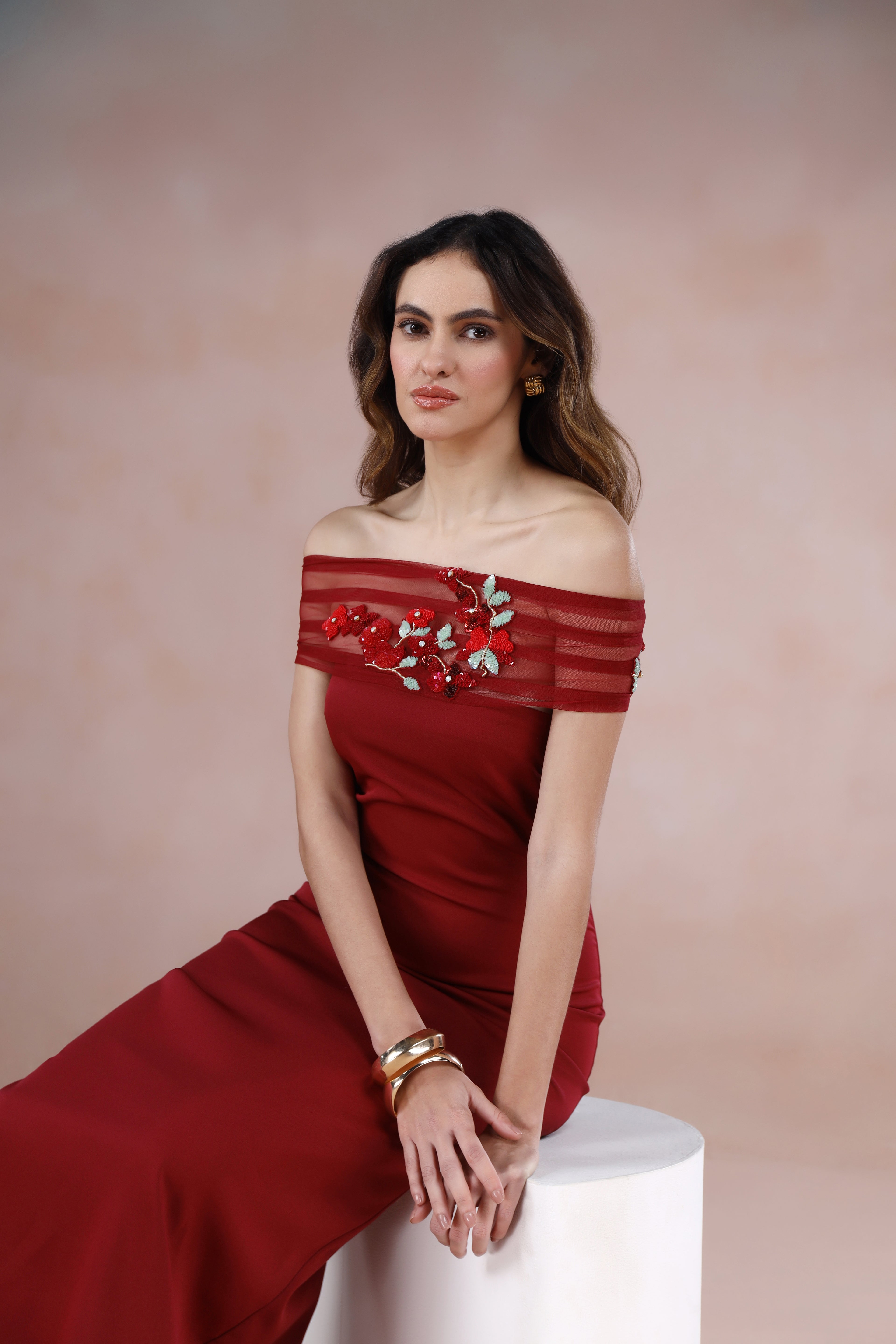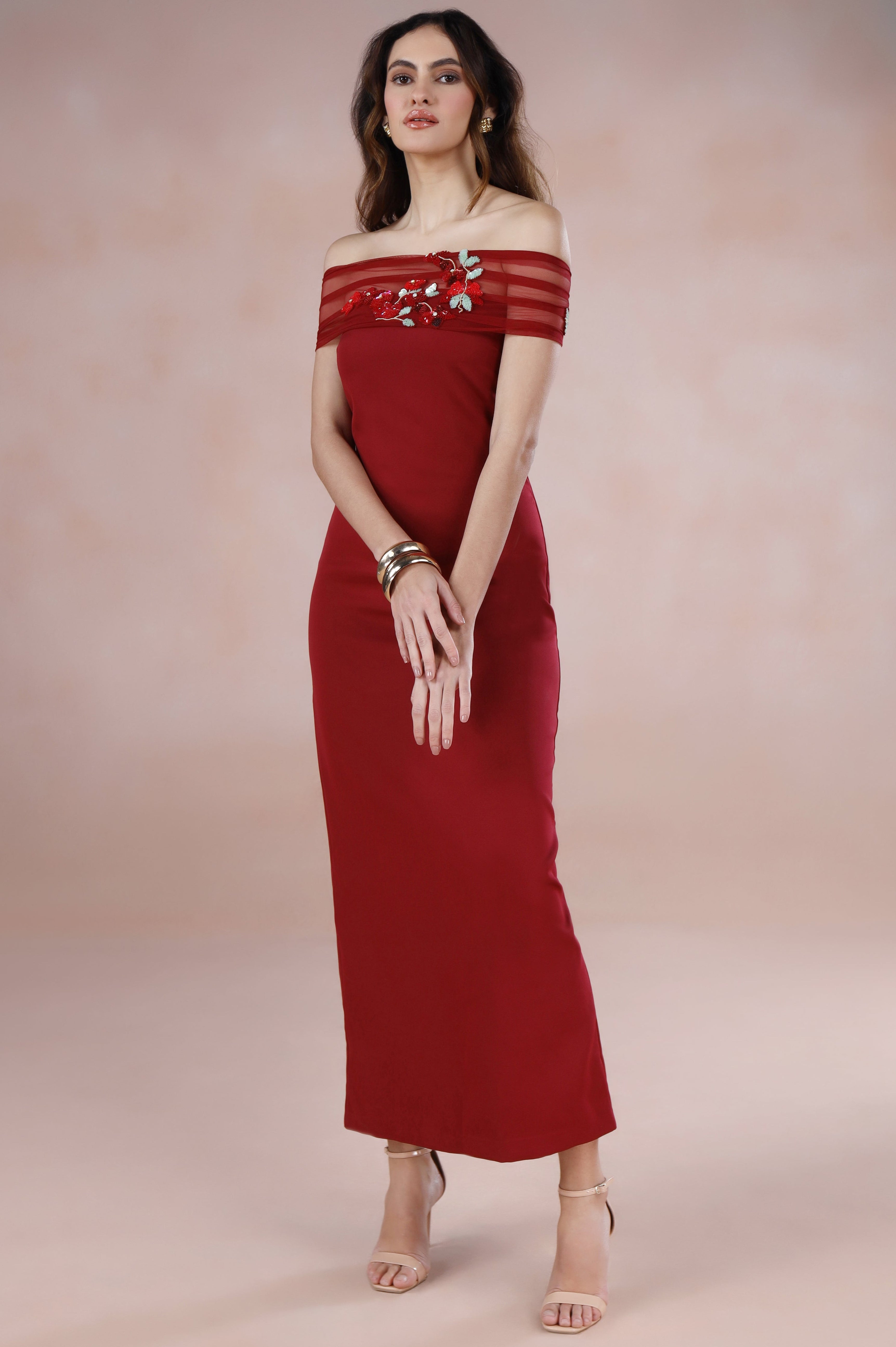 - Sheer off-shoulder netting with hand-embroidered floral motifs in deep reds, tonal maroons, and muted greens