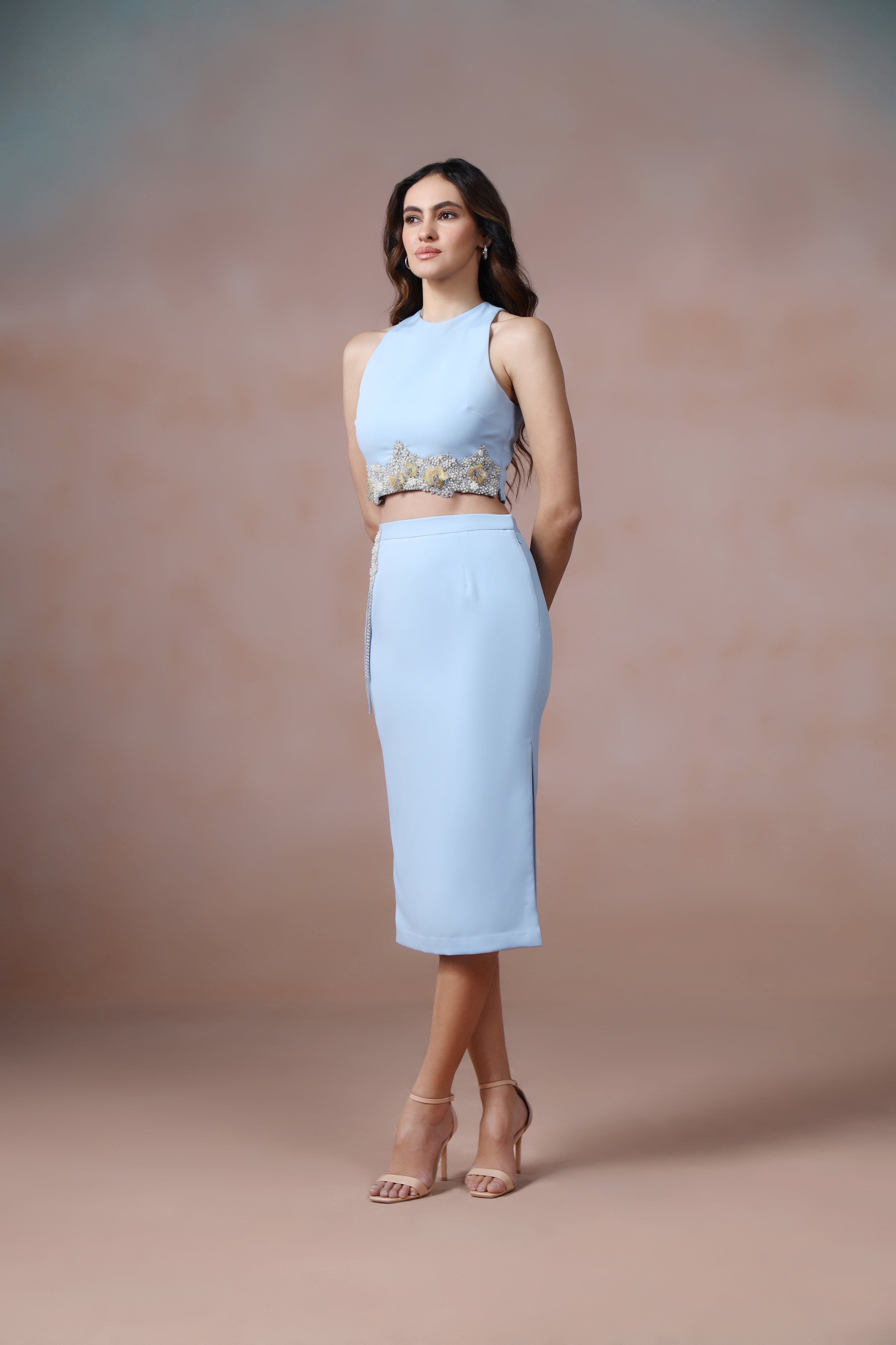 The soft sky blue hue lends freshness and sophistication, allowing the embroidery to stand out with understated elegance. Balanced and thoughtfully crafted, this skirt transitions seamlessly from formal gatherings to evening celebrations, embodying modern luxury with a timeless sensibility. Pairs beautifully with Honey Blue Top.