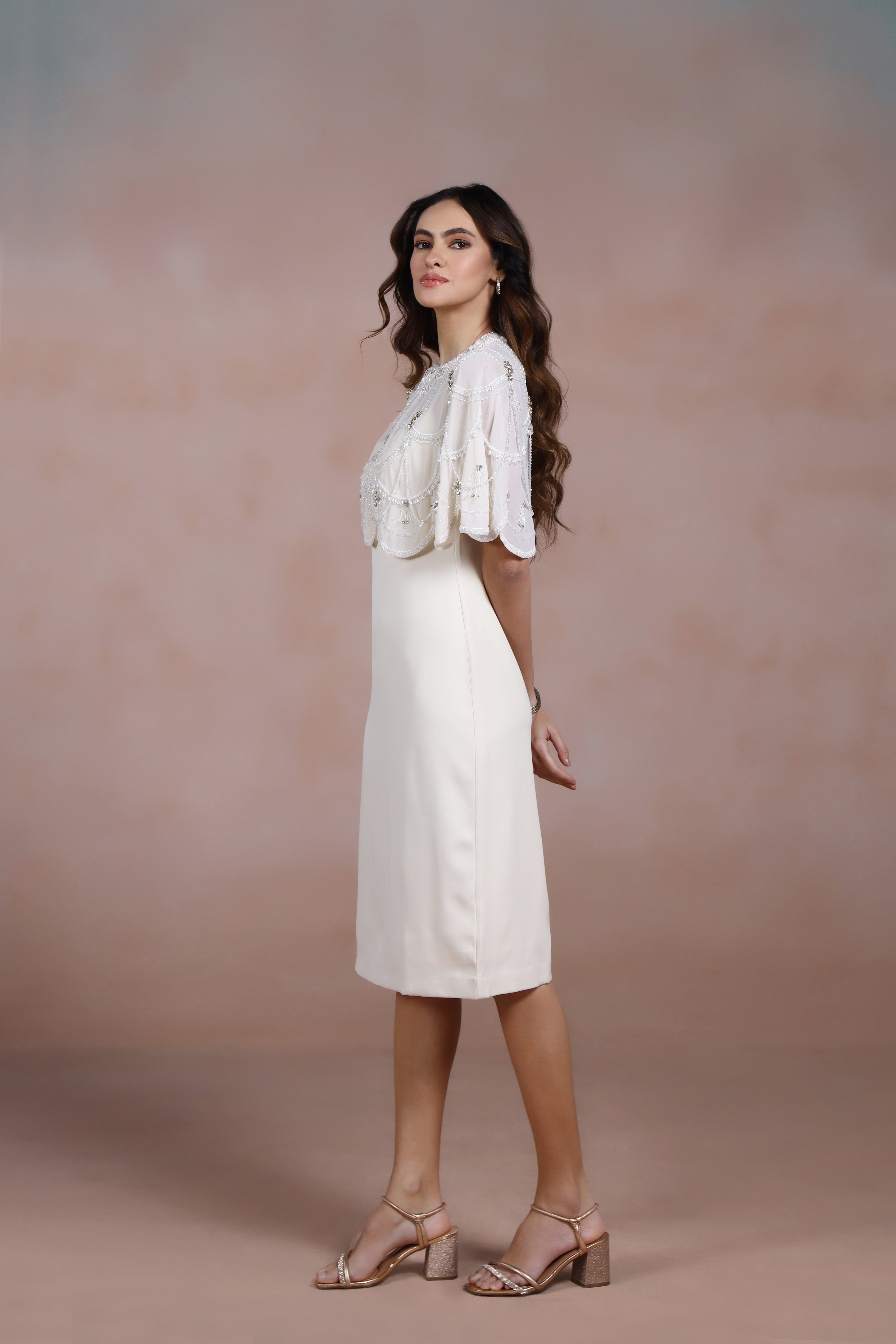 Refresh availabilityAn expression of modern elegance, this white knee-length dress is defined by its purity of form and thoughtful detail. The silhouette is clean and tailored, allowing the craftsmanship to speak without excess. A detachable white cape drapes effortlessly over the shoulders, adding a soft sense of movement and distinction.