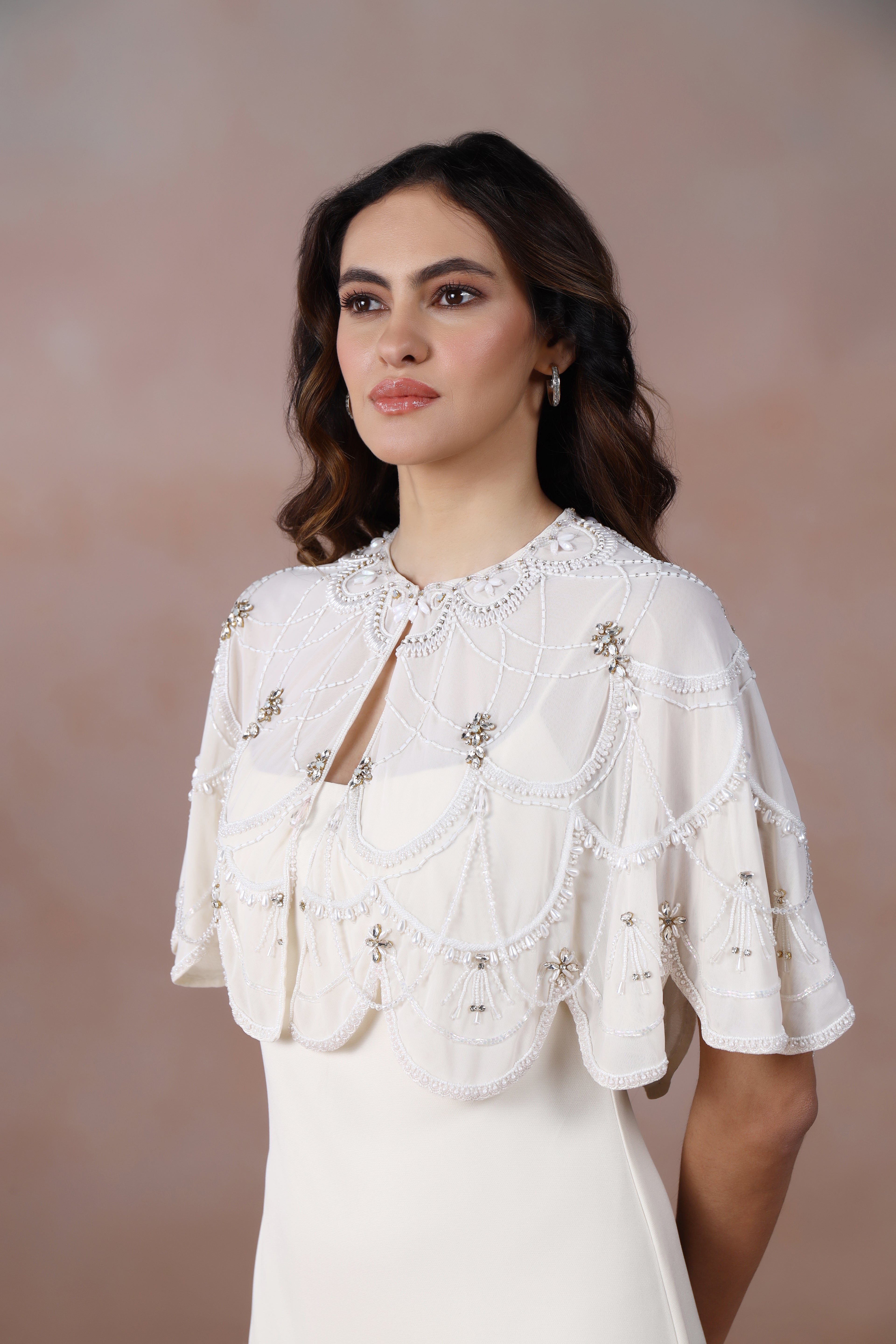 Rendered in the same pristine white, the cape is adorned with subtle monotone hand embroidery—delicate, restrained, and impeccably placed. Together, the dress and cape create a look that is quietly commanding, balancing minimalism with artisanal luxury. Refined yet versatile, this piece embodies effortless sophistication.