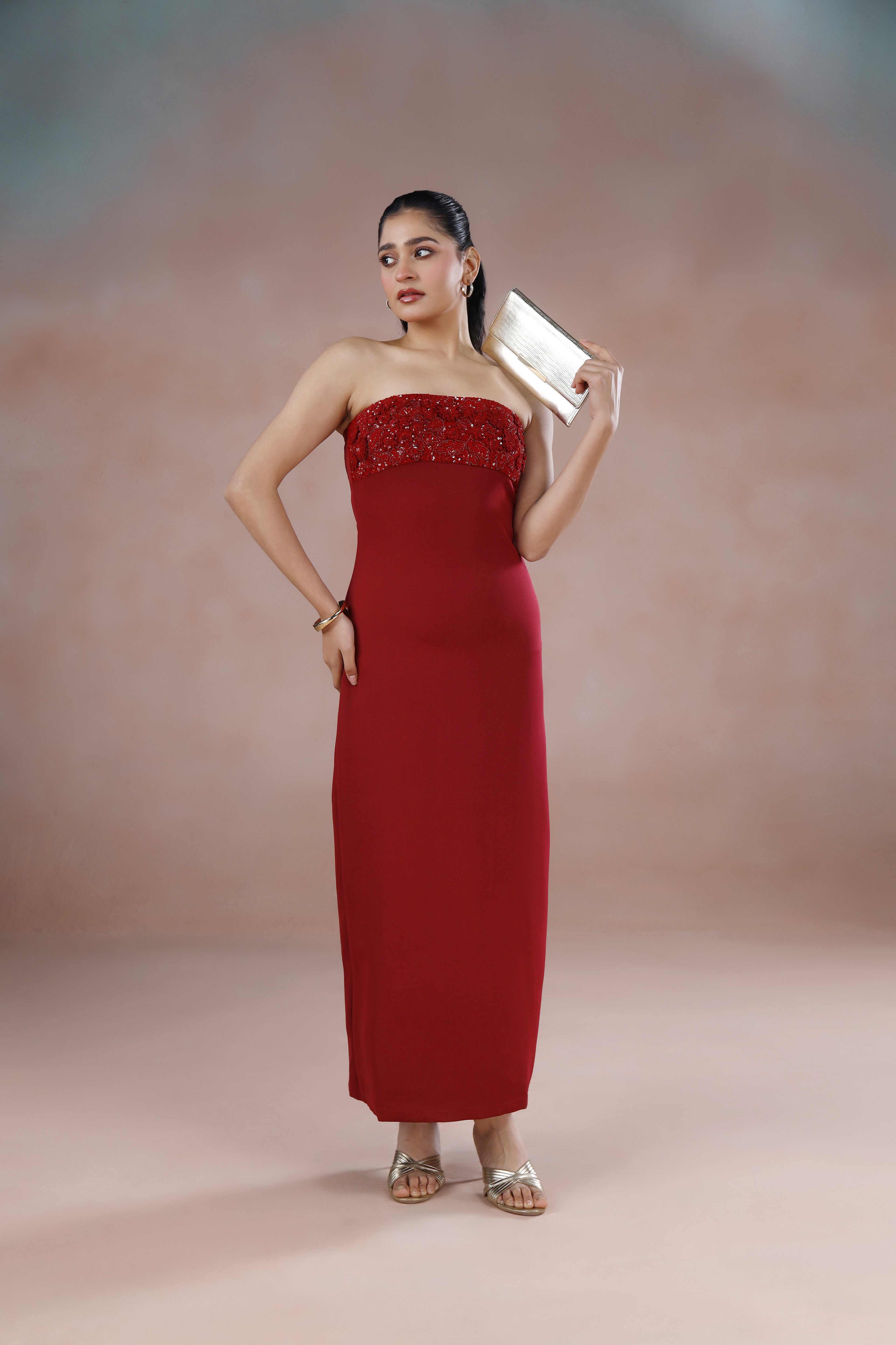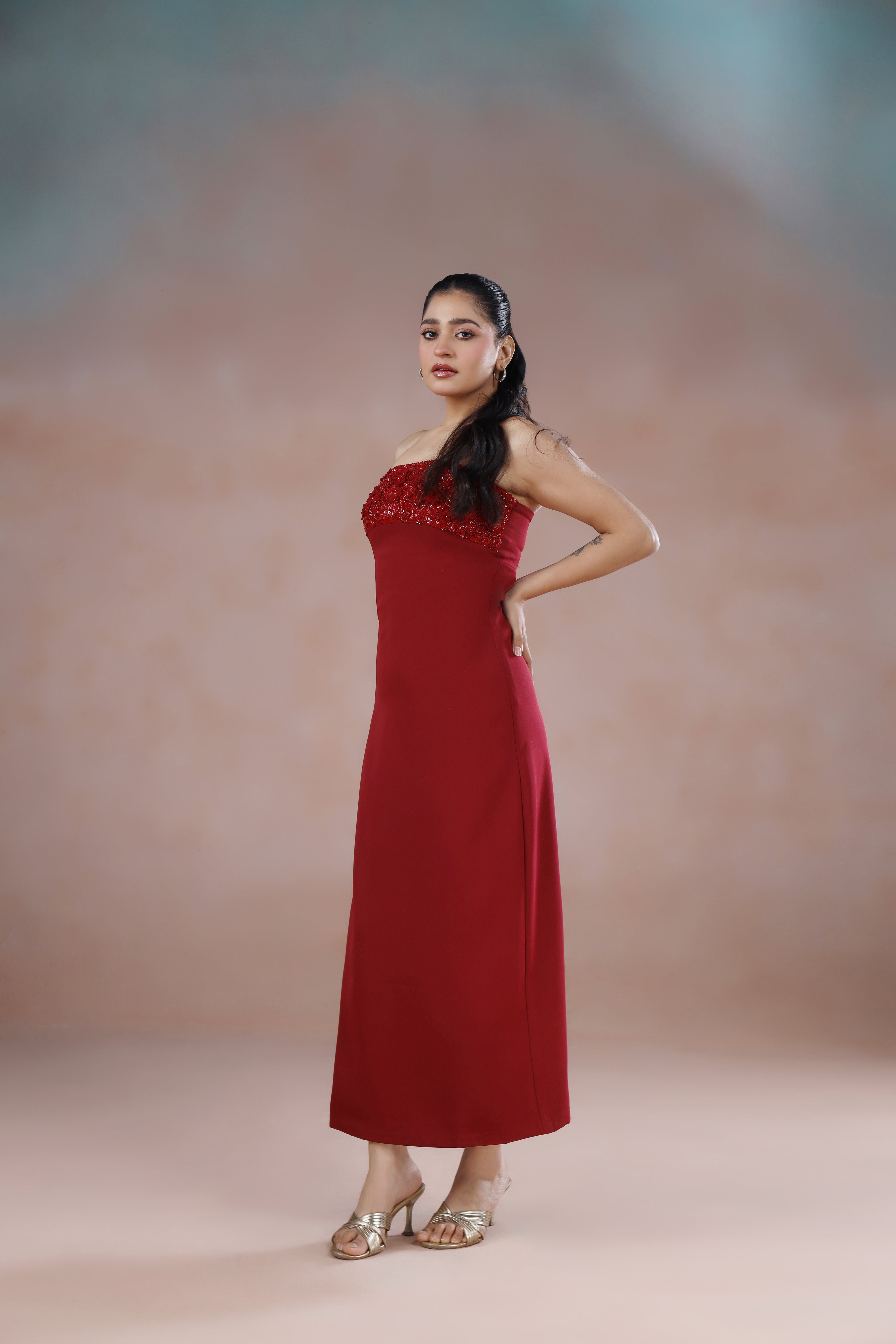 This stunning deep red off-shoulder long dress pairs romantic allure with intricate hand embroidery in matching tones, creating subtle luxury that accentuates natural curves.