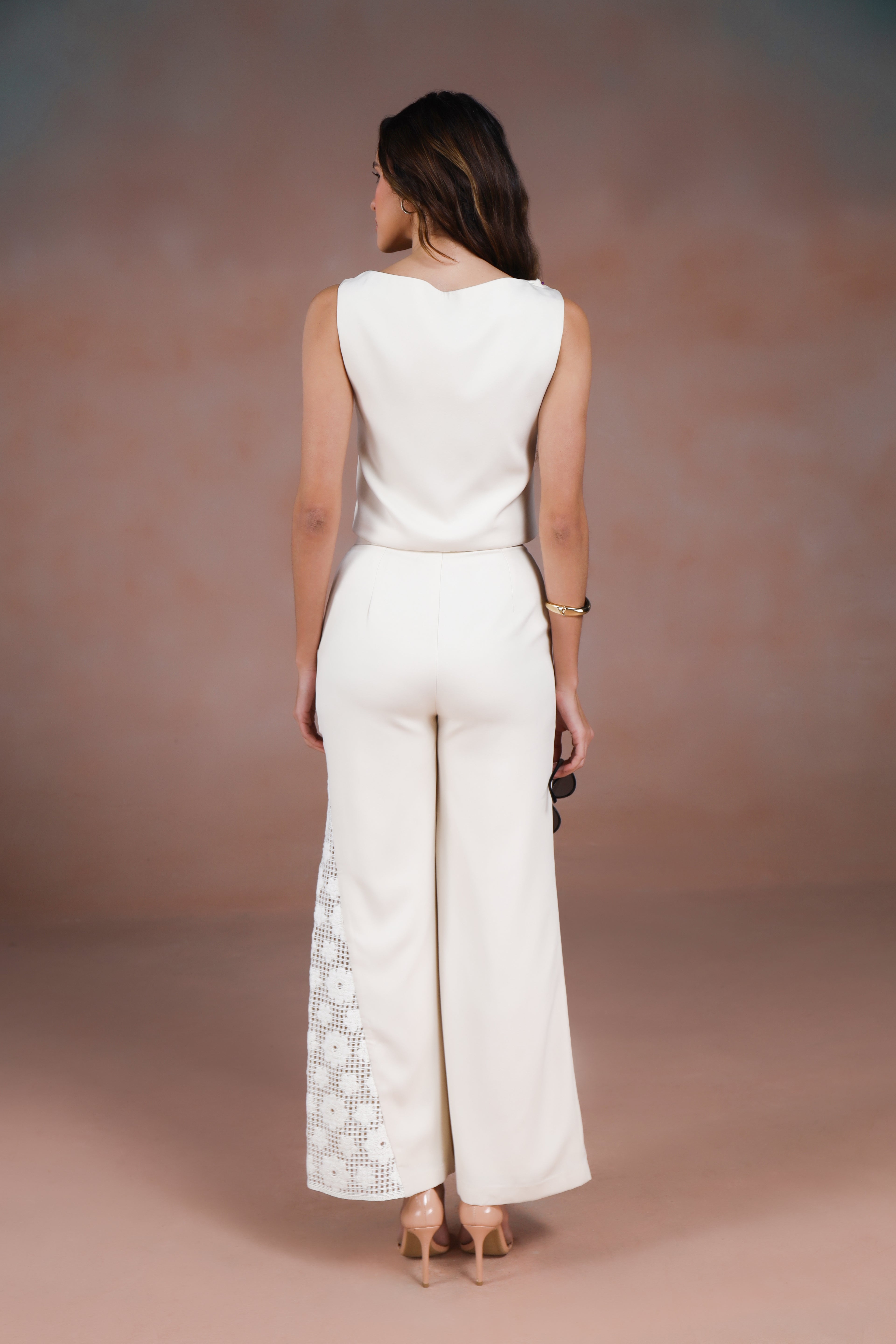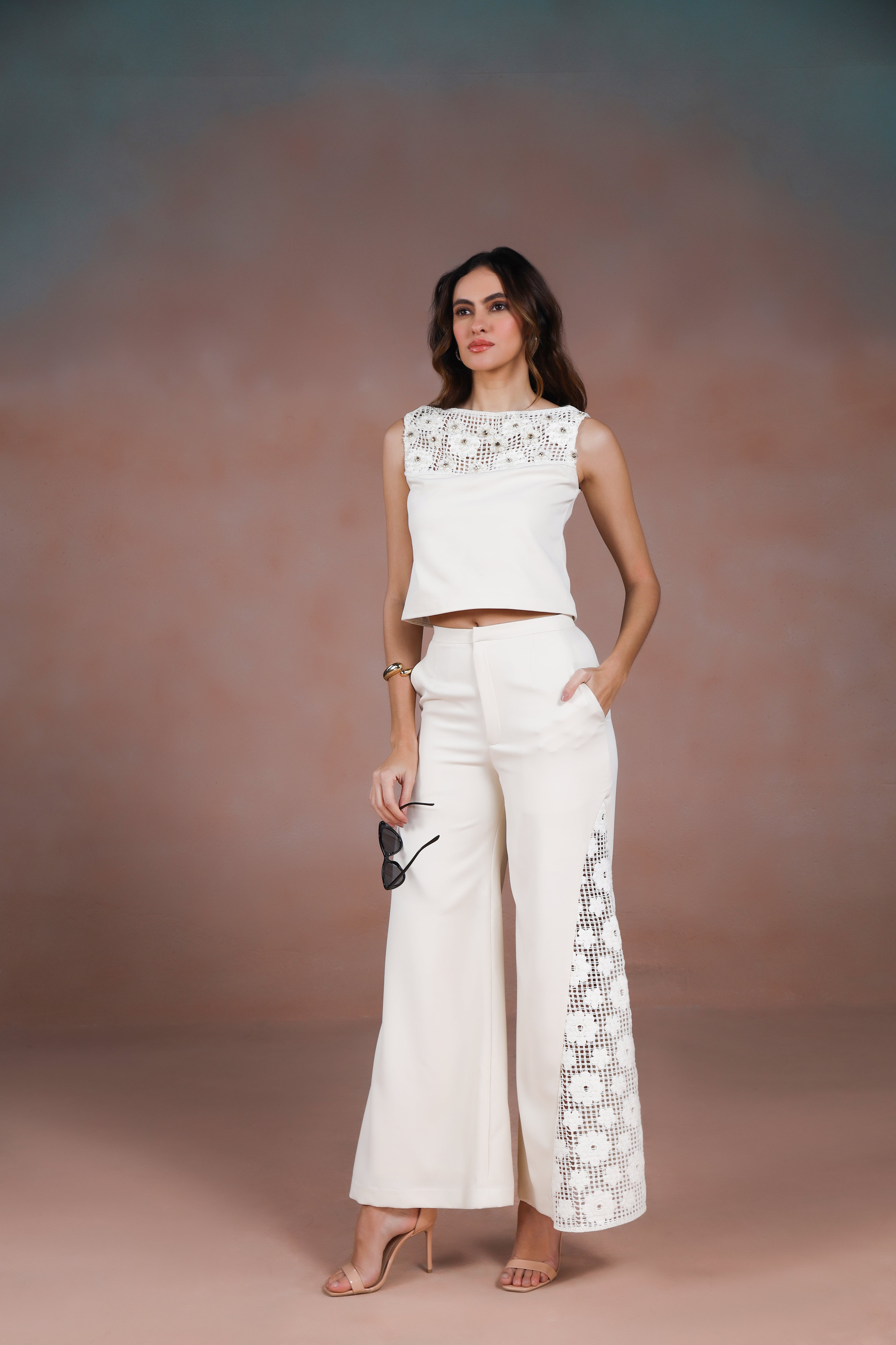 Refresh availabilitySophisticated with a couture-inspired edge, these ivory pants are designed to elevate tailoring through craftsmanship and detail. Cut to flatter with a clean, refined silhouette, they bring effortless polish to any look. The sides are finished with delicate mesh panels, beautifully adorned with embroidered floral motifs and subtle embellishments that add dimension, texture, and quiet glamour.