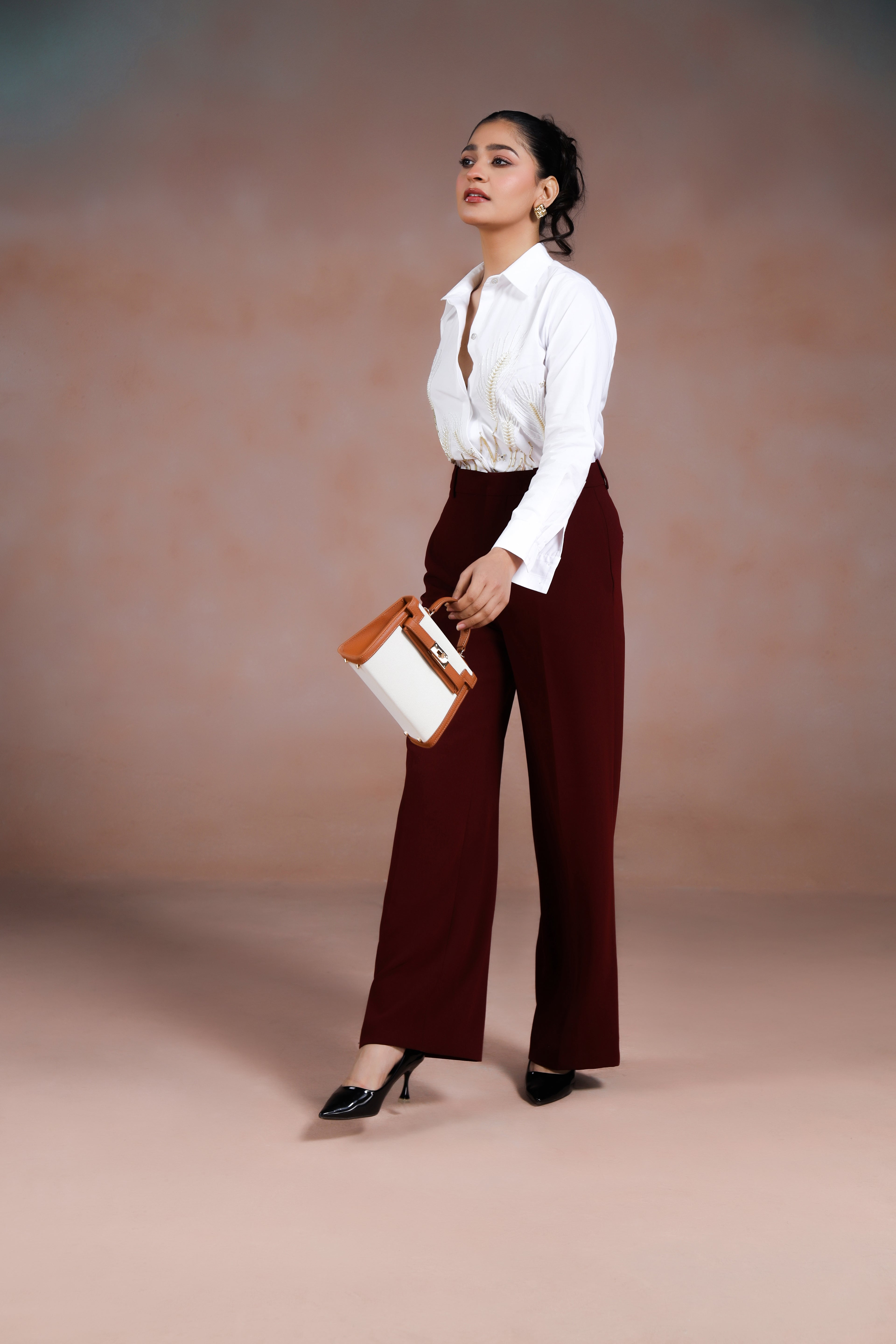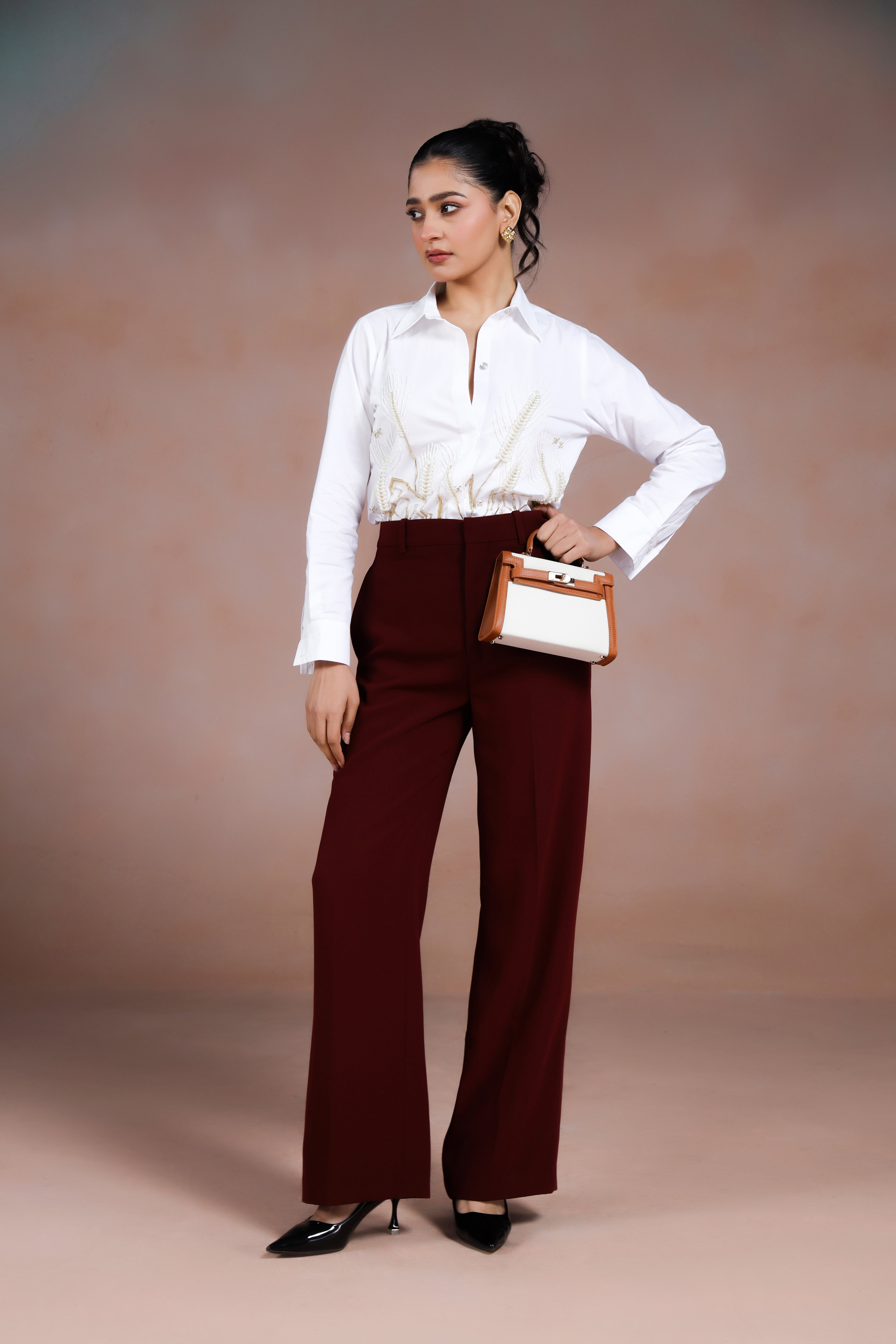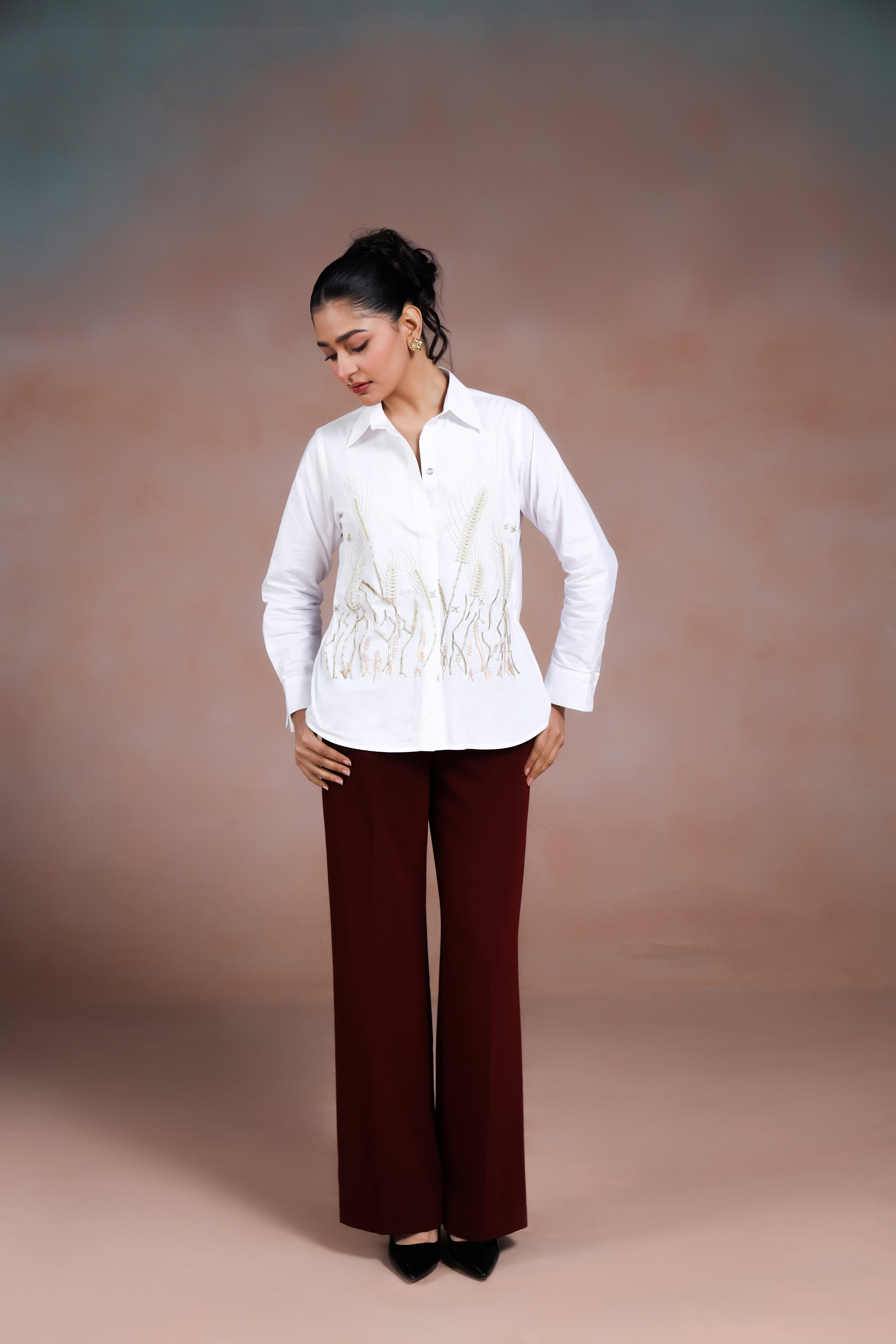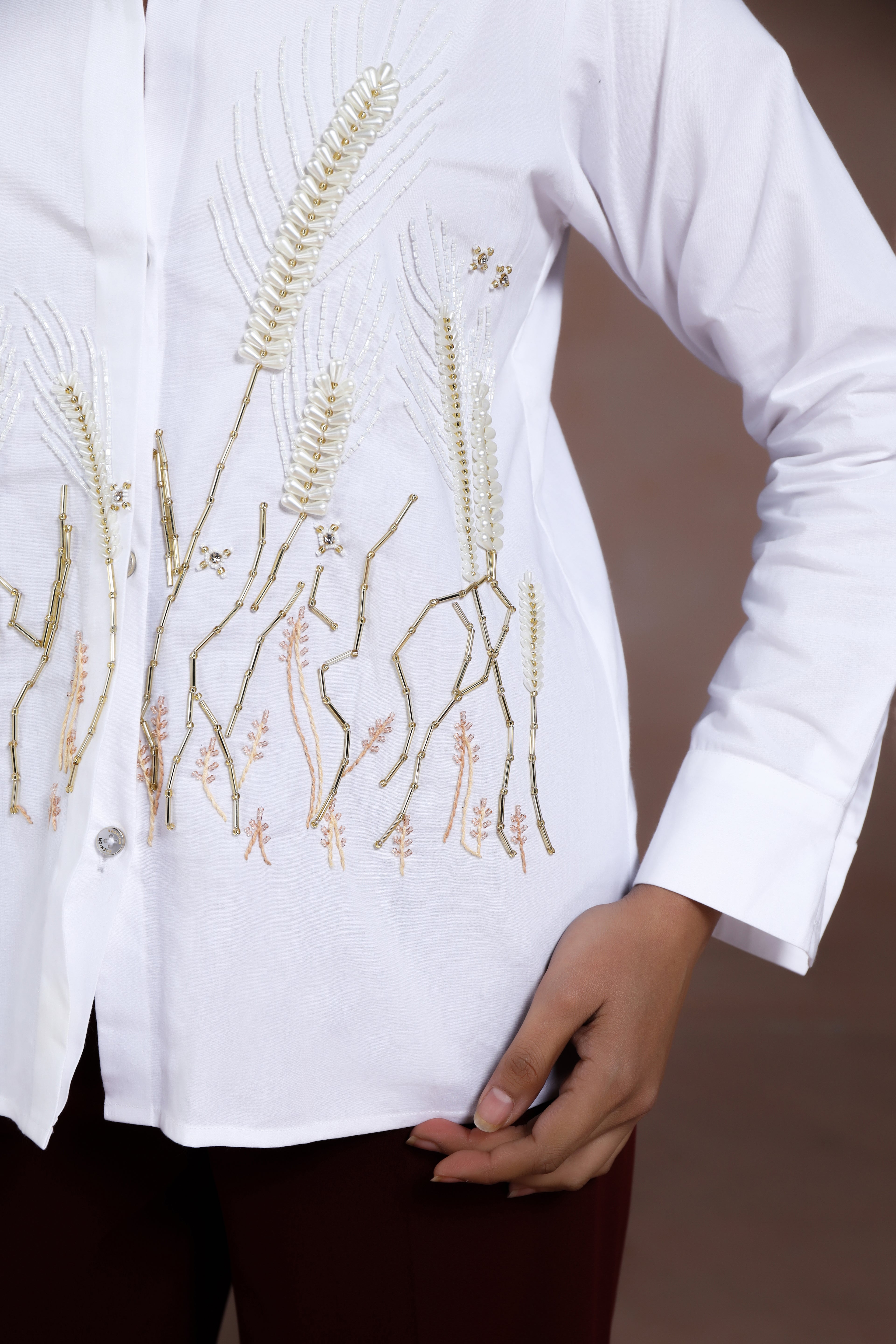 This shirt is adorned with delicate hand embroidery of wheatgrass, highlighted with luminous pearl detailing. The subtle shimmer of the pearls adds sophistication while the nature-inspired motif brings a sense of freshness and charm. Perfect for elevating both casual and semi-formal looks.