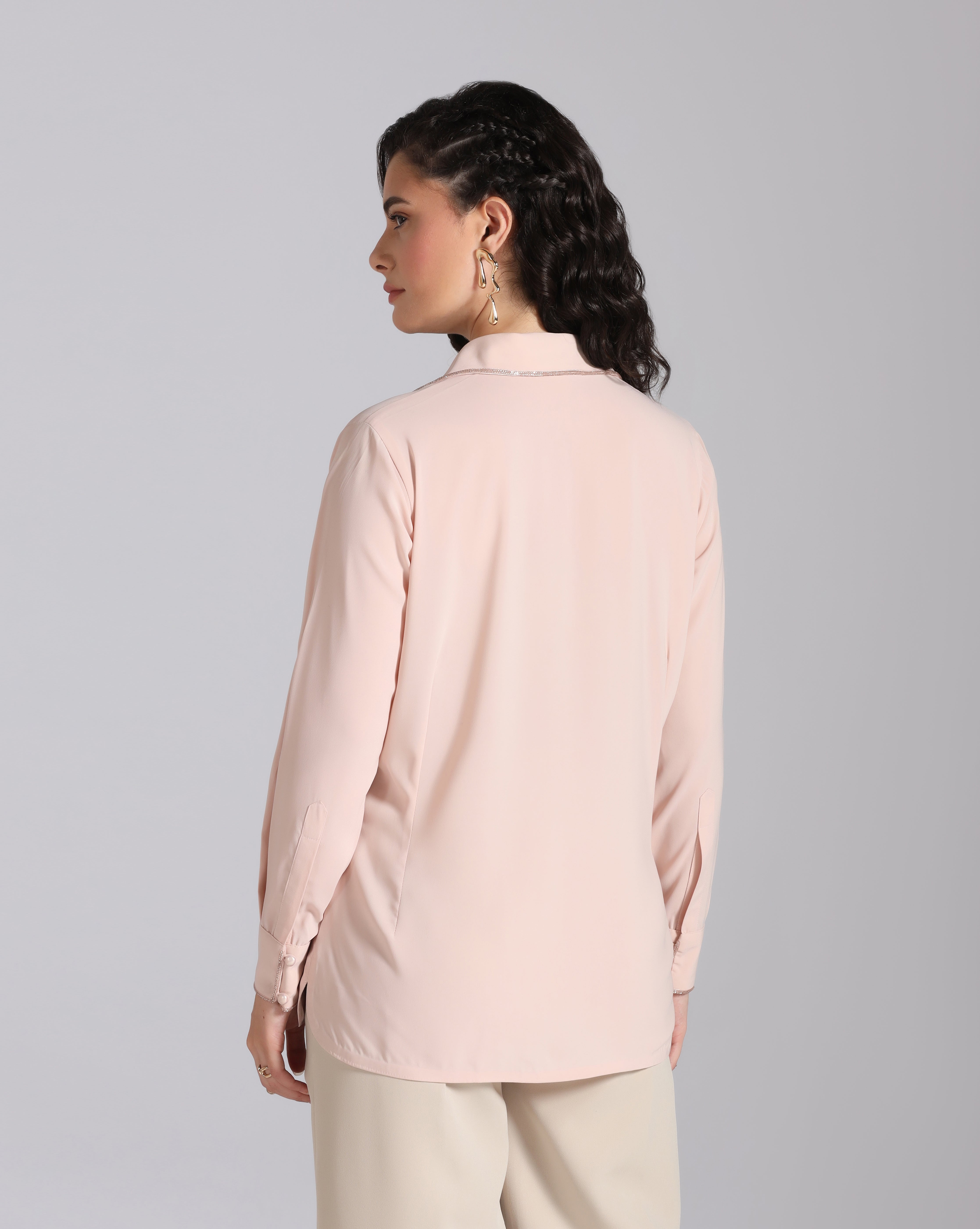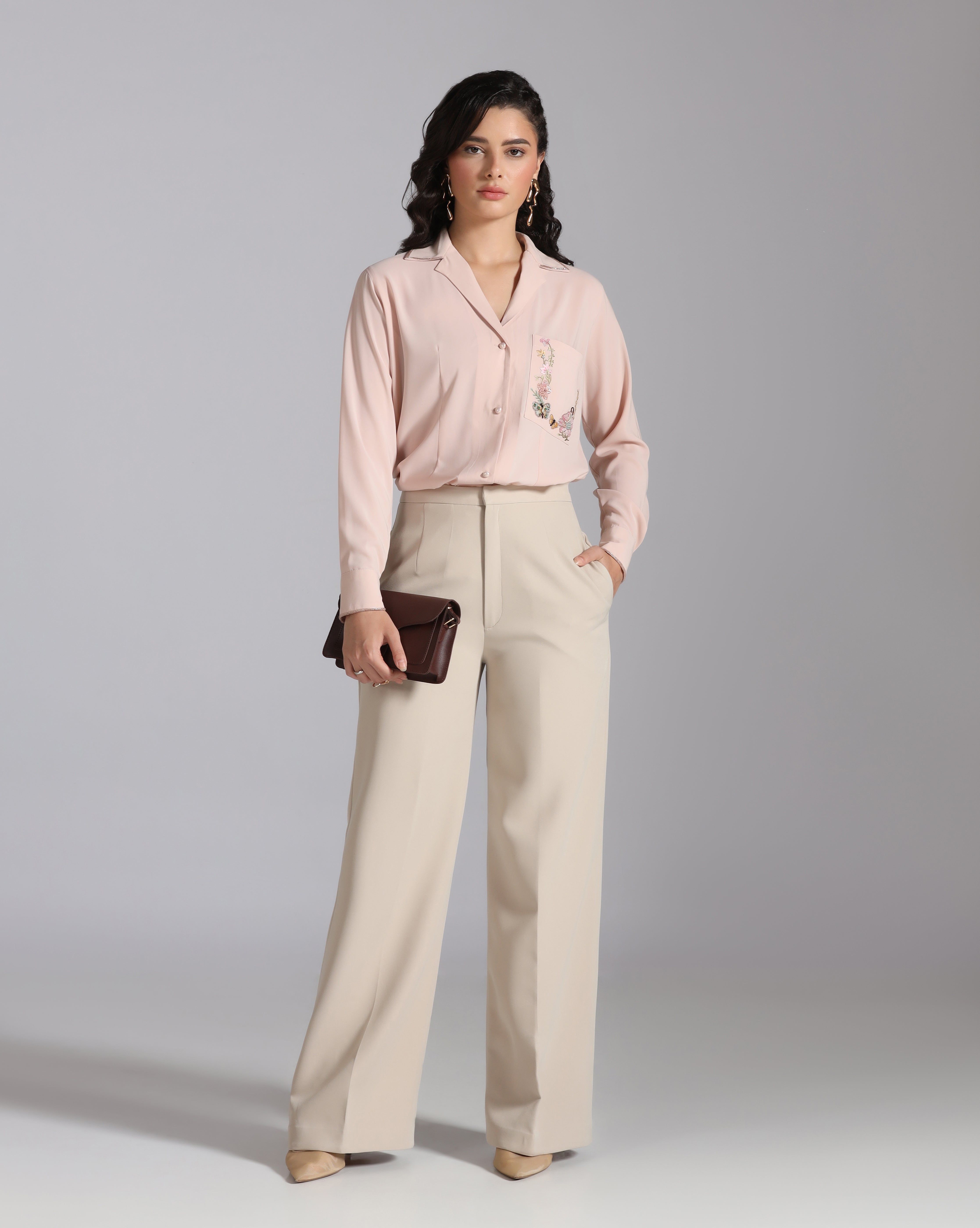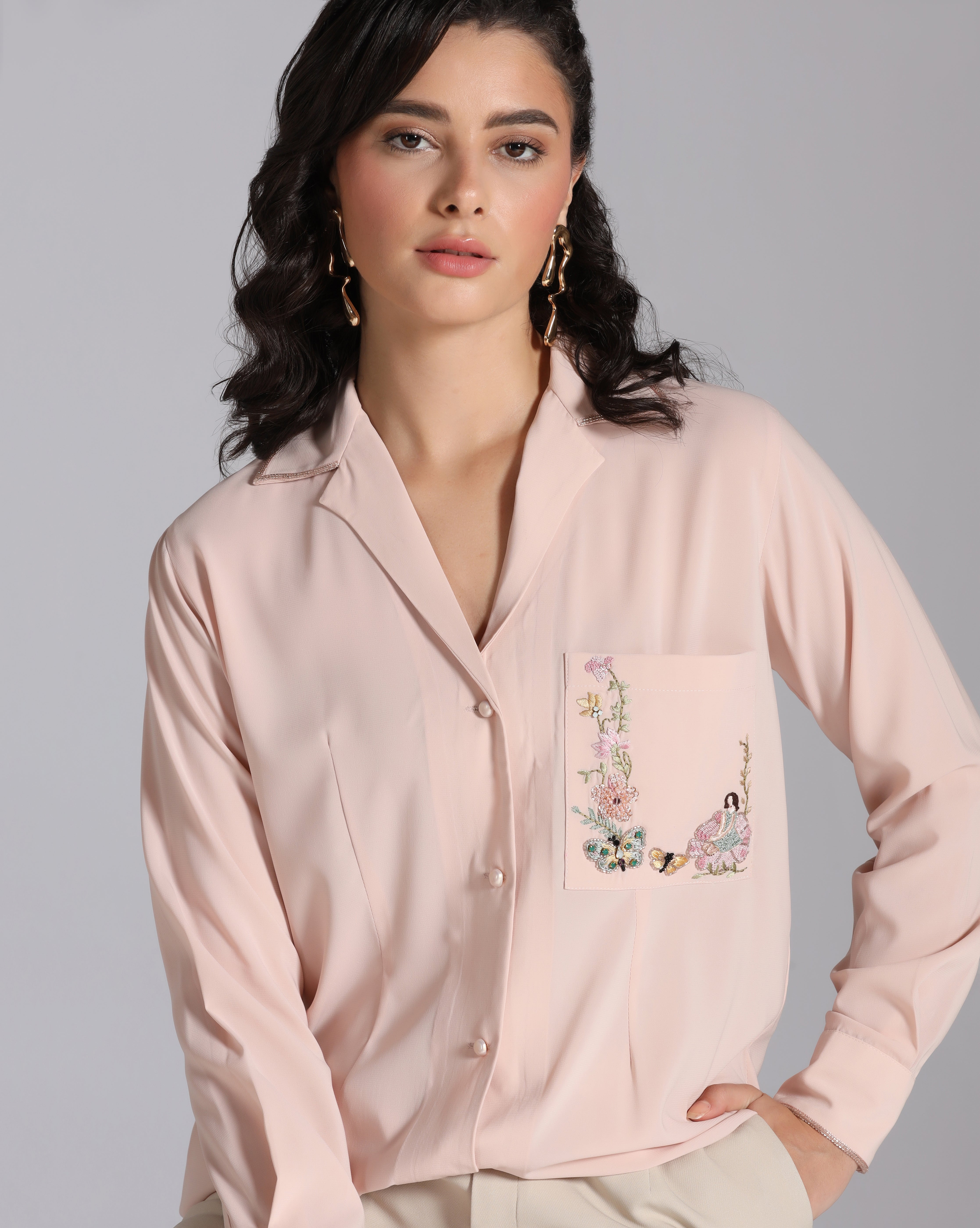 Refresh availabilityPlayful meets elegant in this light pink shirt, designed with a single front pocket that becomes the highlight of the piece. The pocket features delicate hand embroidery of flowers alongside a whimsical character, adding artistry and charm to a classic silhouette. This shirt brings individuality to everyday style.