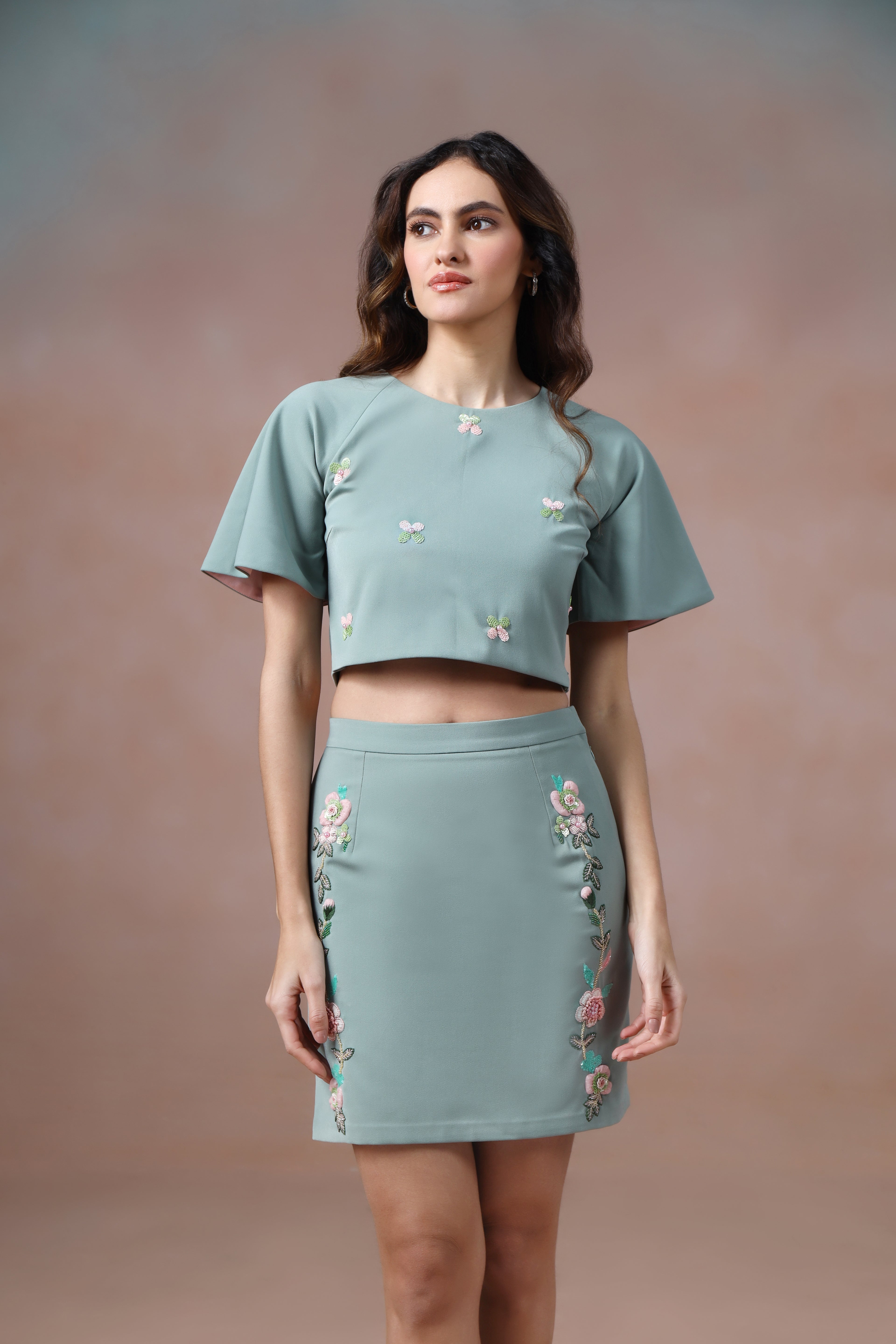 Refresh availabilityFresh, feminine, and beautifully crafted, this pastel green crop top is designed to bring effortless elegance to any look. The soft, calming hue creates a refined base, elevated by delicate hand embroidery in multiple shades of pink and green. Each stitch is thoughtfully placed, adding dimension and artistry while maintaining a clean, sophisticated finish.