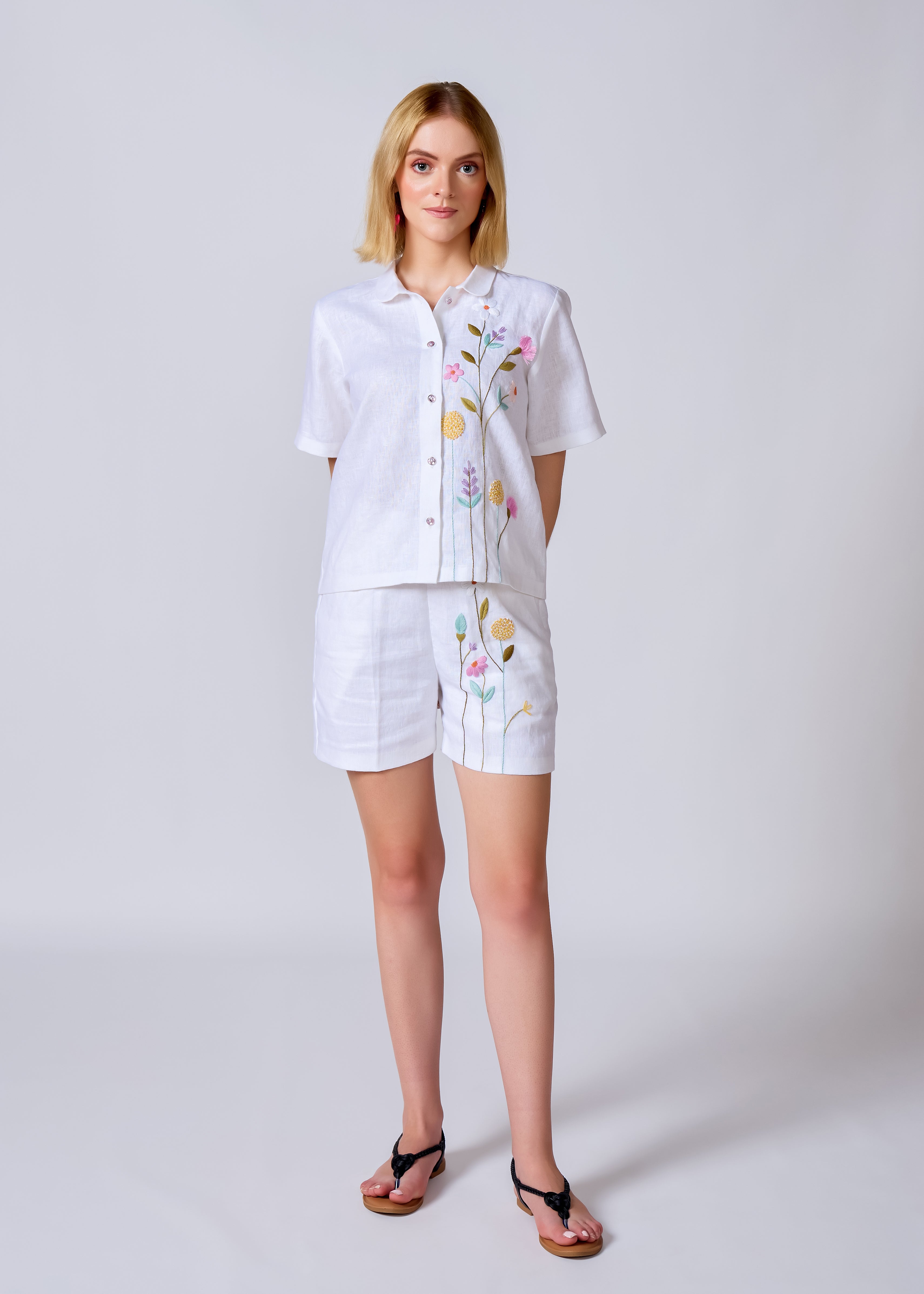 Refresh availabilityFresh and contemporary, this white co-ord set features tailored shorts paired with a shirt-style top for a chic yet effortless look. The highlight of the design is the hand embroidery of flowers with long, graceful stems, adding artisanal charm and feminine elegance to the crisp silhouette.