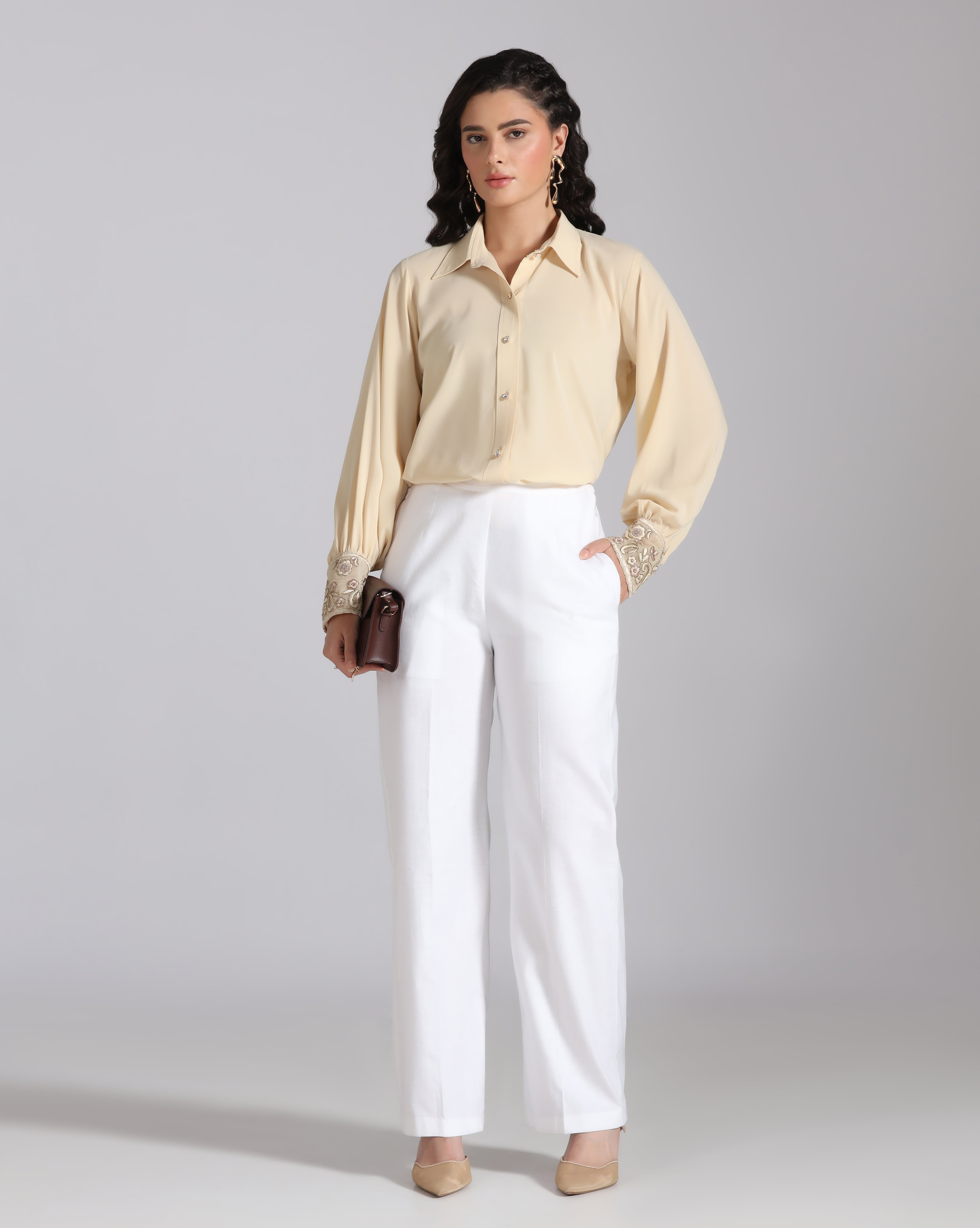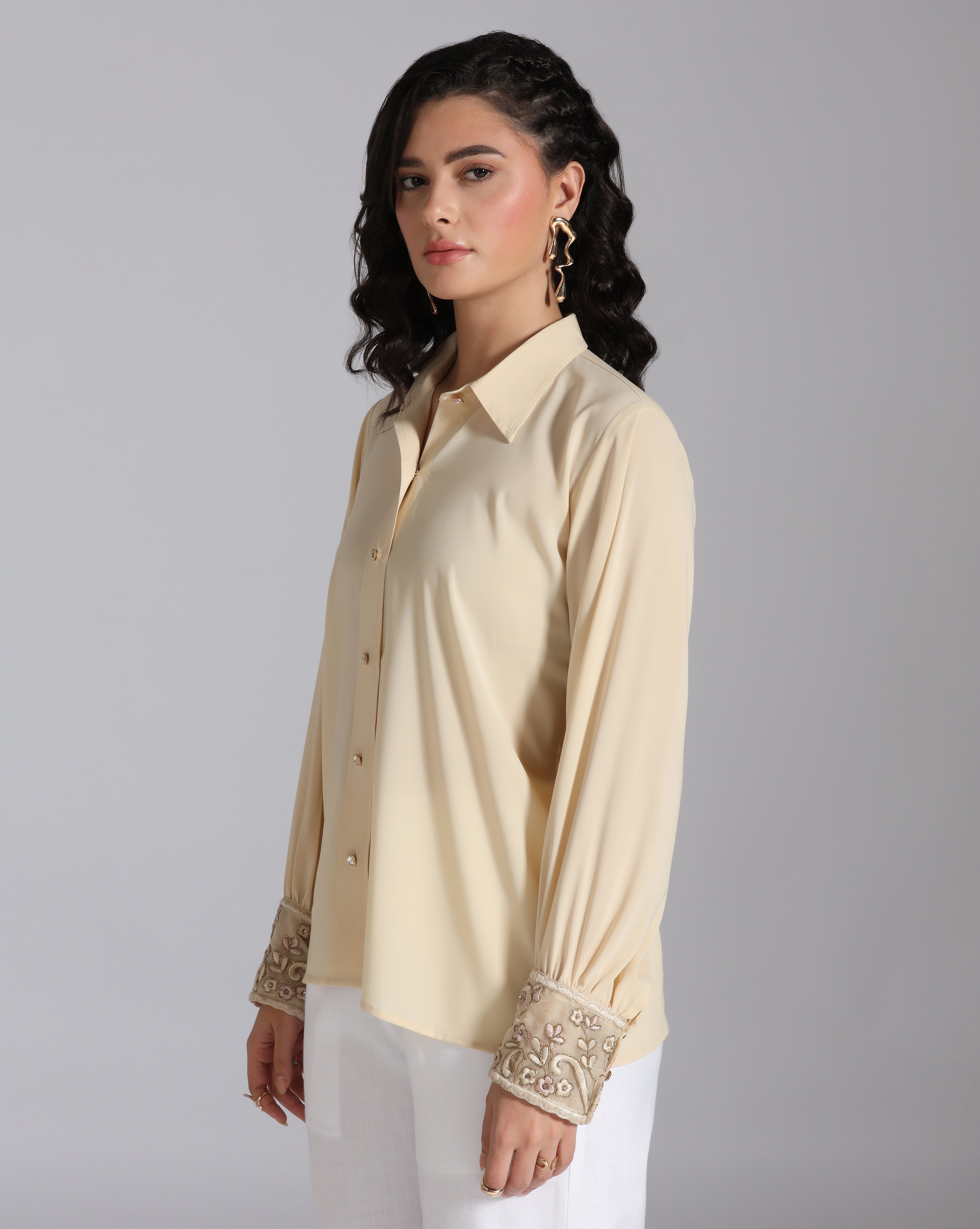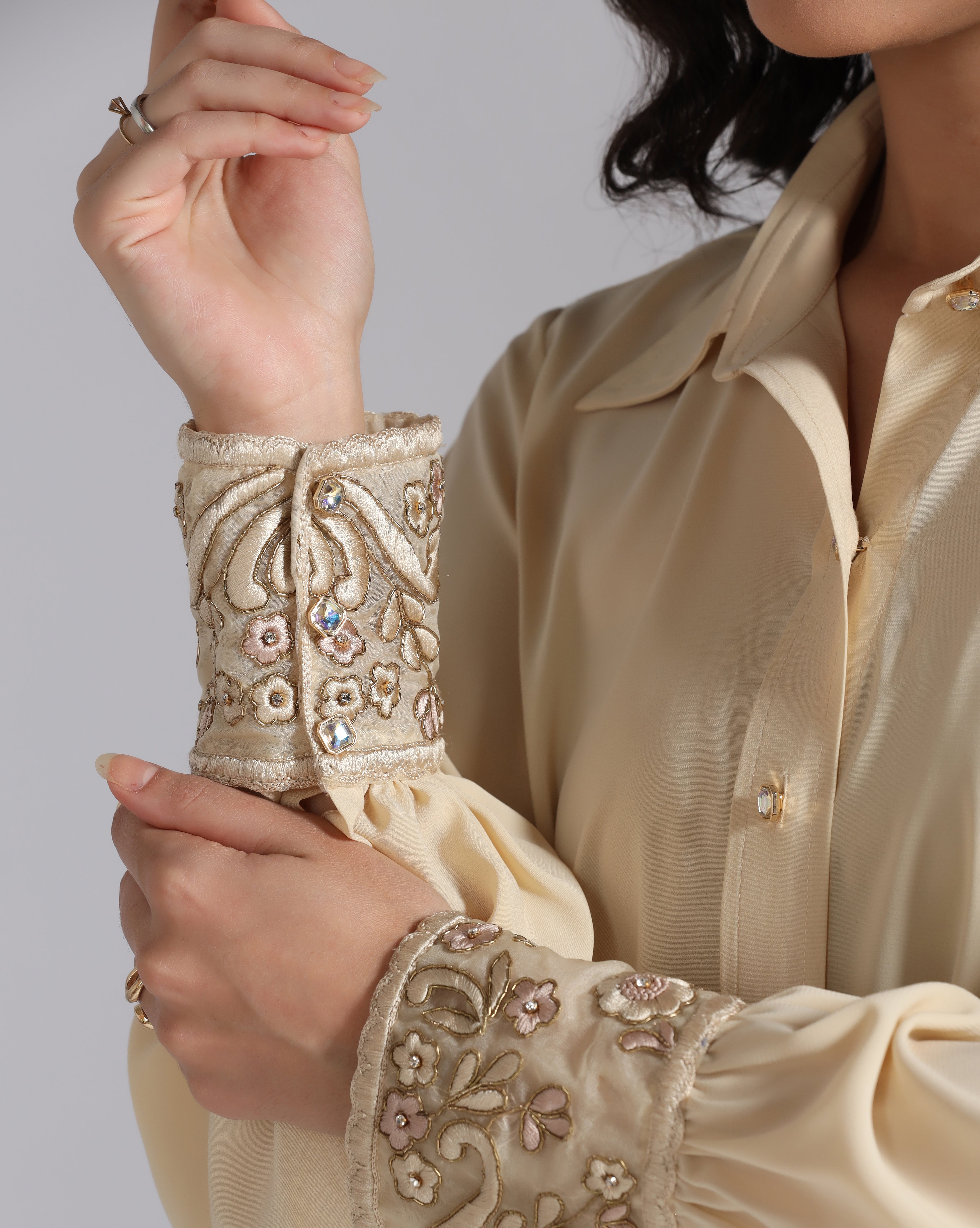 Refresh availabilityElevate your wardrobe with this honey beige shirt, a perfect balance of sophistication and artisanal detail. The highlight of the design lies in its elongated cuffs, beautifully adorned with intricate hand embroidery that adds a touch of elegance and craftsmanship. Versatile enough for both office wear and evening outings, this shirt makes a subtle yet striking statement.